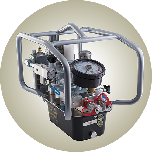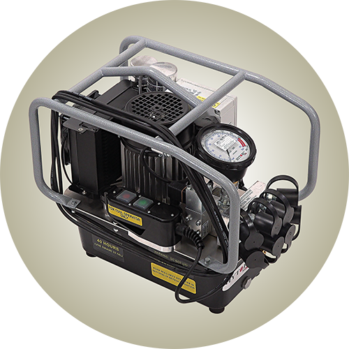 The HY-TWIN AIR hydraulic pump gives you the power of up to 10,000 ft.-lbs. for bolting. Fitted with a 5-gallon reservoir, this pump can have enough oil to power up to four large tools at once.